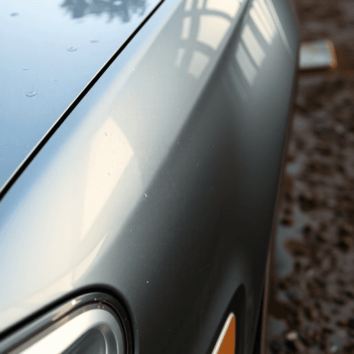 Close-up of a used car with water droplets and reflections, parked on muddy ground with soft natural light, highlighting hidden flood damage risks.